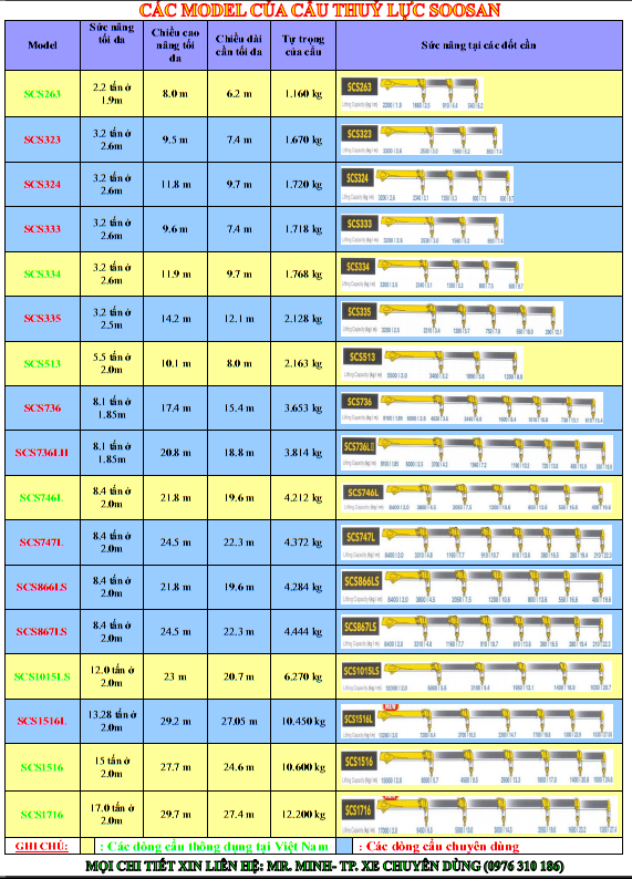 - Xe tải gắn cẩu Soosan SCS1015LS: Sức nâng max 12t/2.0m, tầm với max: 20.7m/1030kg