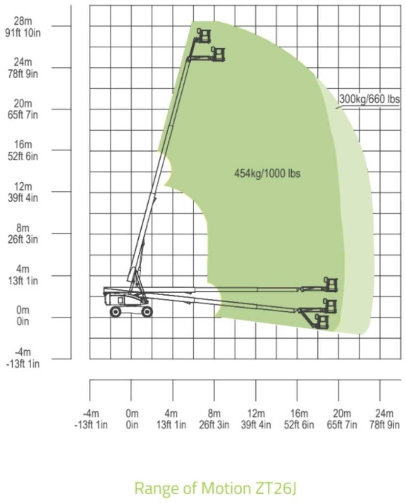 Với chiều cao làm việc ấn tượng lên đến 28.2 mét và tầm vươn ngang xa đáng kinh ngạc 23.31 mét, ZT26J mở ra khả năng tiếp cận những vị trí khó khăn nhất một cách dễ dàng. Dù là công trình xây dựng quy mô lớn, bảo trì nhà xưởng công nghiệp, lắp đặt hệ thống hay sửa chữa điện trên cao, ZT26J đều là đối tác đáng tin cậy của bạn.