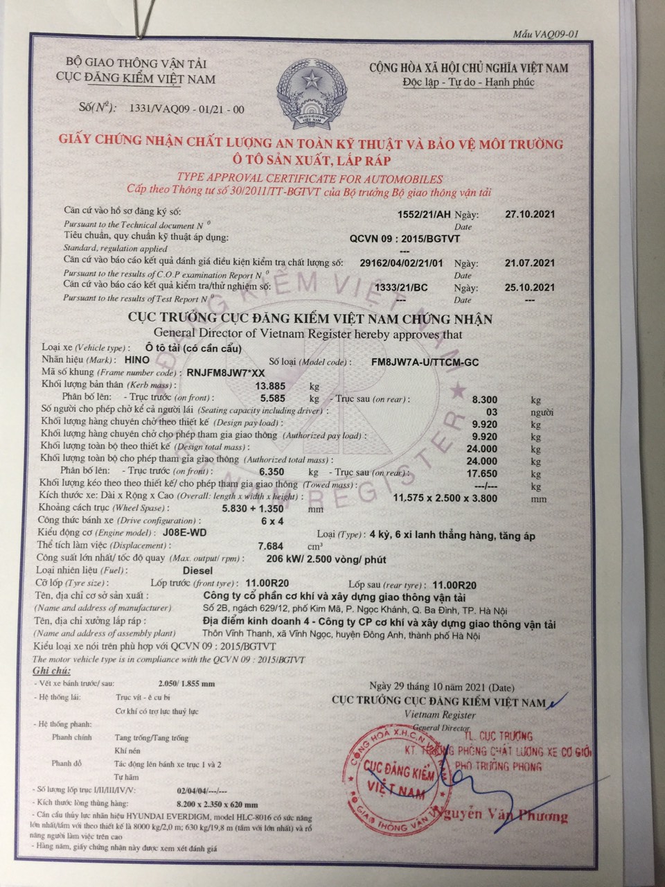 | Nhãn hiệu | HINO FM8JW7A |