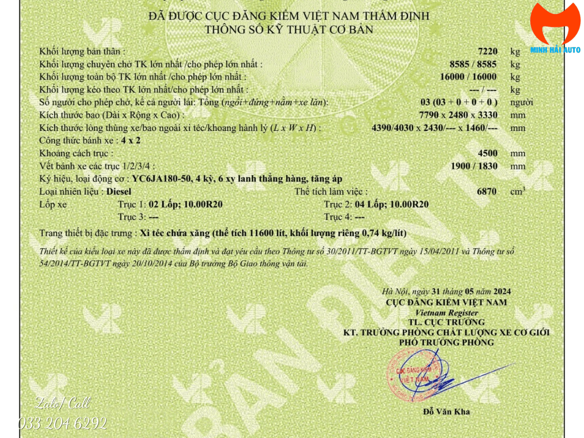 Dưới đây là bảng thông số kỹ thuật chi tiết của xe theo Giấy chứng nhận số 11413/VAQ09-24/24-00, giúp Quý khách hàng có cái nhìn tổng quan và chính xác nhất về sản phẩm xe téc chở xăng dầu 11 khối này.